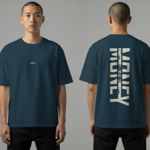 A bold, street-ready oversized t-shirt in a deep petrol blue. Featuring a minimal "OEEEEE" chest logo and a striking vertical "MONEY" graphic on the back that reveals a hidden glimpse of a Benjamin.