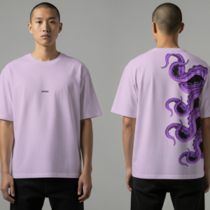 Embrace the mystery of the abyss with this lilac oversized tee. Featuring a minimalist "OEEEEE" chest logo and a dramatic, hand-drawn purple octopus tentacle climbing the back, it’s the perfect blend of street-style edge and aquatic intrigue.
