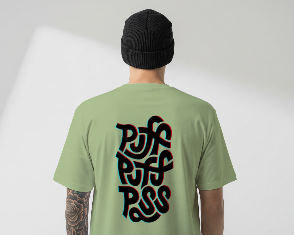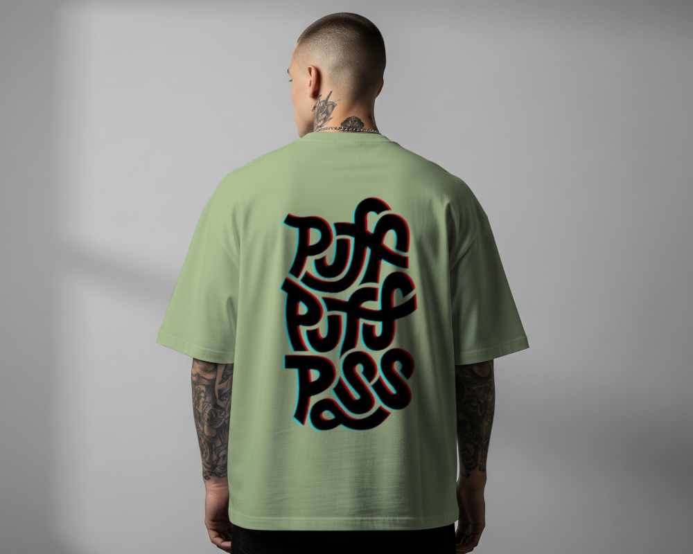 The Glitch Trip Oversized Tee is designed for those who move at their own pace. Set against a calming, earthy Sage Green canvas, this shirt features a bold, trippy typographical design on the back. The “PUFF PUFF PASS” lettering is rendered in a distorted, multi-layered “glitch” style with cyan and red 3D offsets that pop off the fabric.