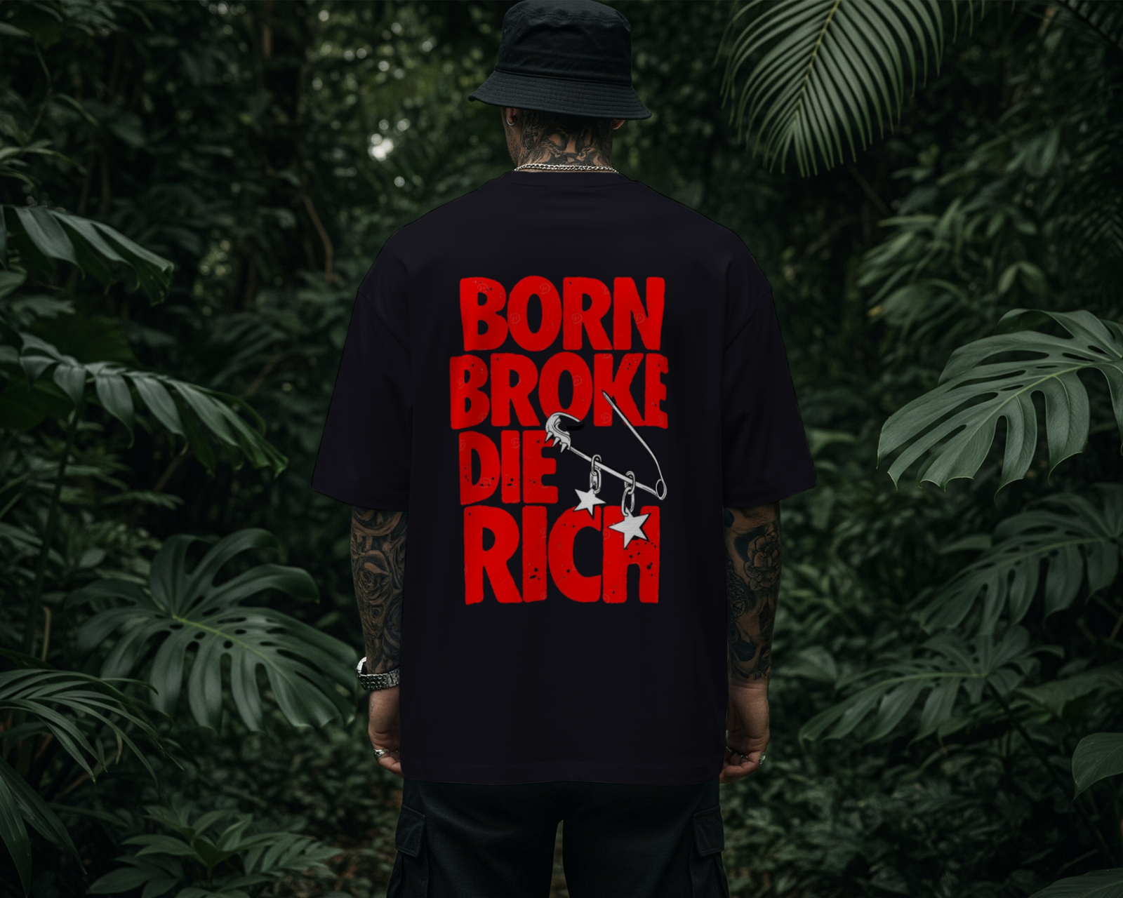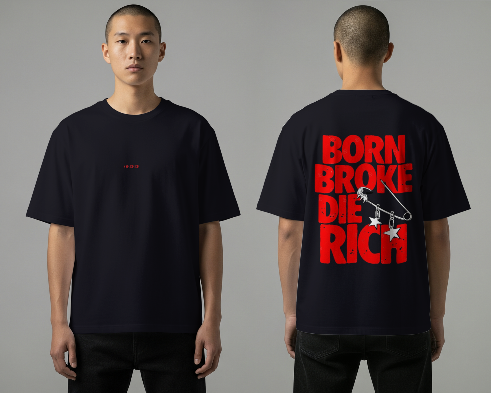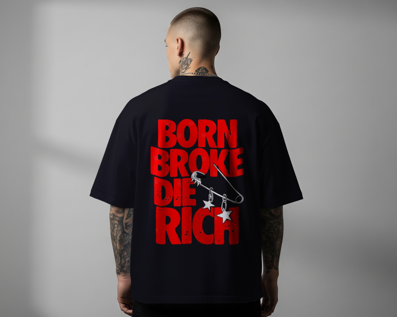 The “Legacy” Tee captures the raw energy of the hustle. The front features a discreet, micro-logo in crimson red, offering a clean look for layered outfits. The back demands attention with a high-impact, distressed typographic design. The “Born Broke Die Rich” mantra is overlaid with a stylized safety pin graphic, featuring hanging star charms that add a punk-inspired, DIY edge to the modern streetwear silhouette.