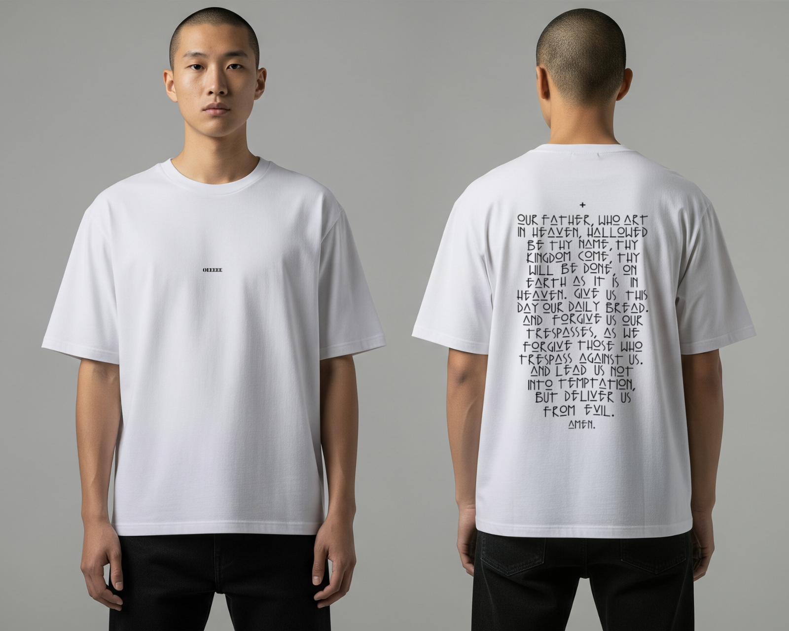 A bold fusion of spiritual tradition and modern streetwear. This premium heavyweight white tee features a minimalist “OEEEEE” chest logo and a striking, full-back typography of The Lord’s Prayer in a custom architectural font. Designed with an intentional oversized fit for those who lead with faith and style.