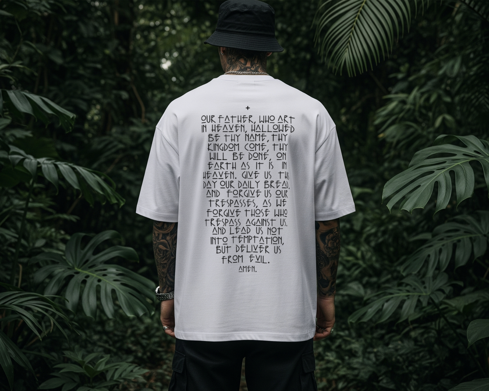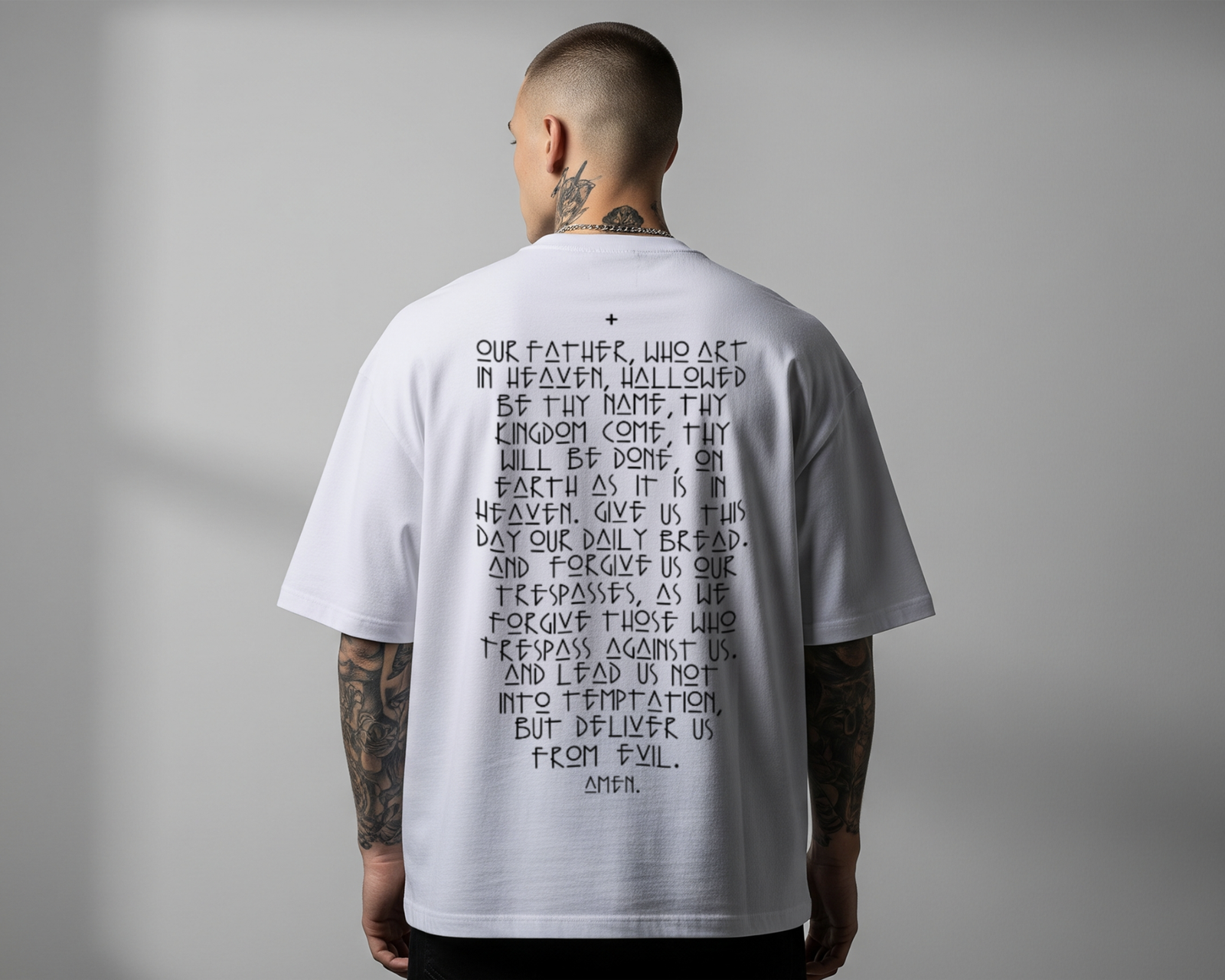 The Sanctuary Oversized Tee is more than just a garment; it’s a wearable testament. Bridging the gap between contemporary urban aesthetics and timeless devotion, this piece serves as a silent conversation starter. The front remains clean and understated, while the back makes a powerful statement, showcasing the entirety of the “Our Father” prayer in a unique, geometric typeface that feels both ancient and futuristic.