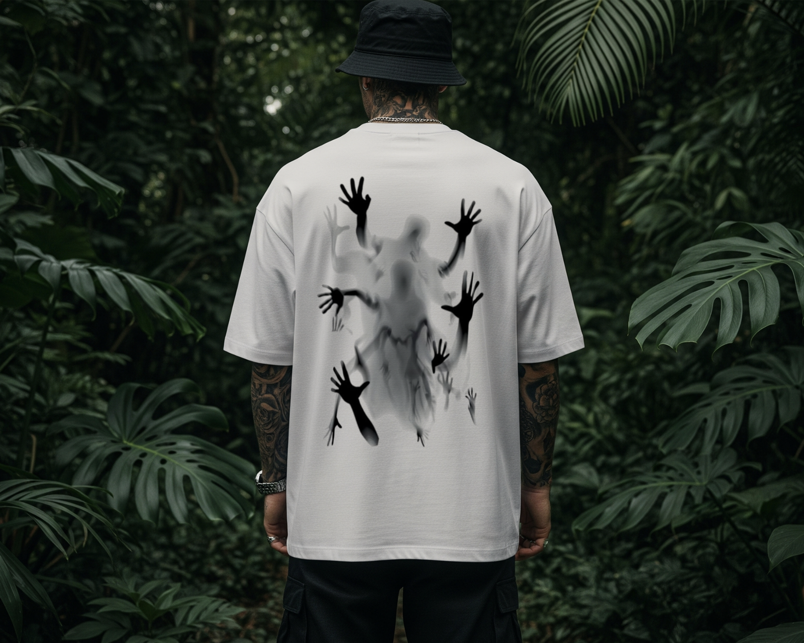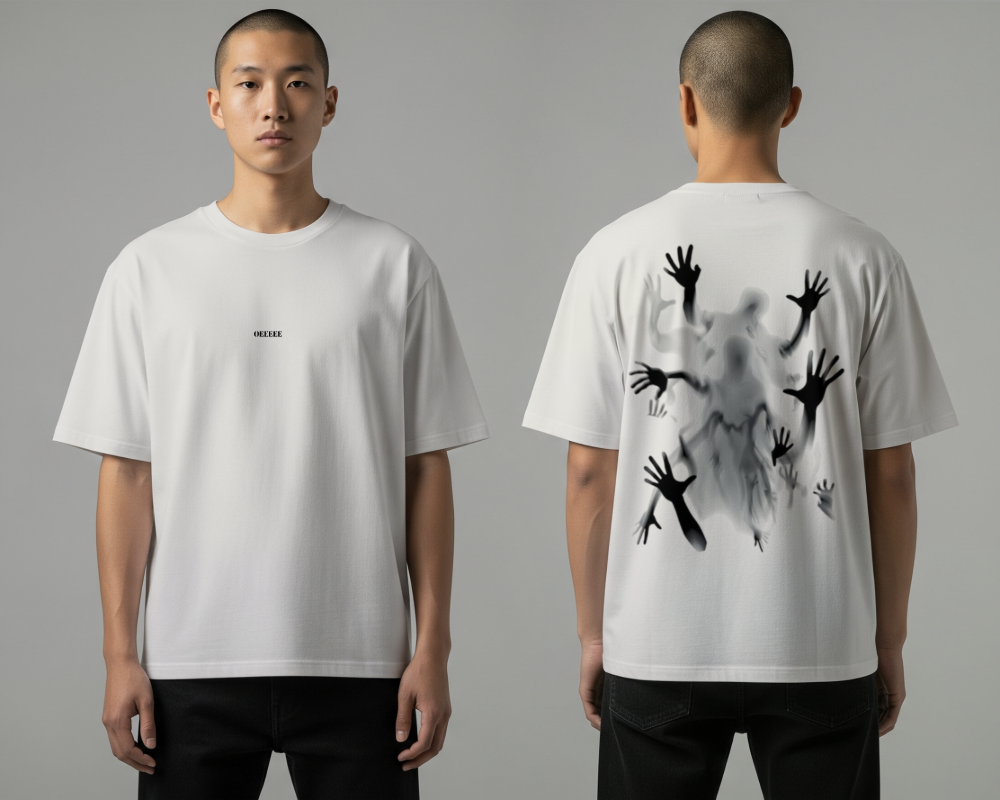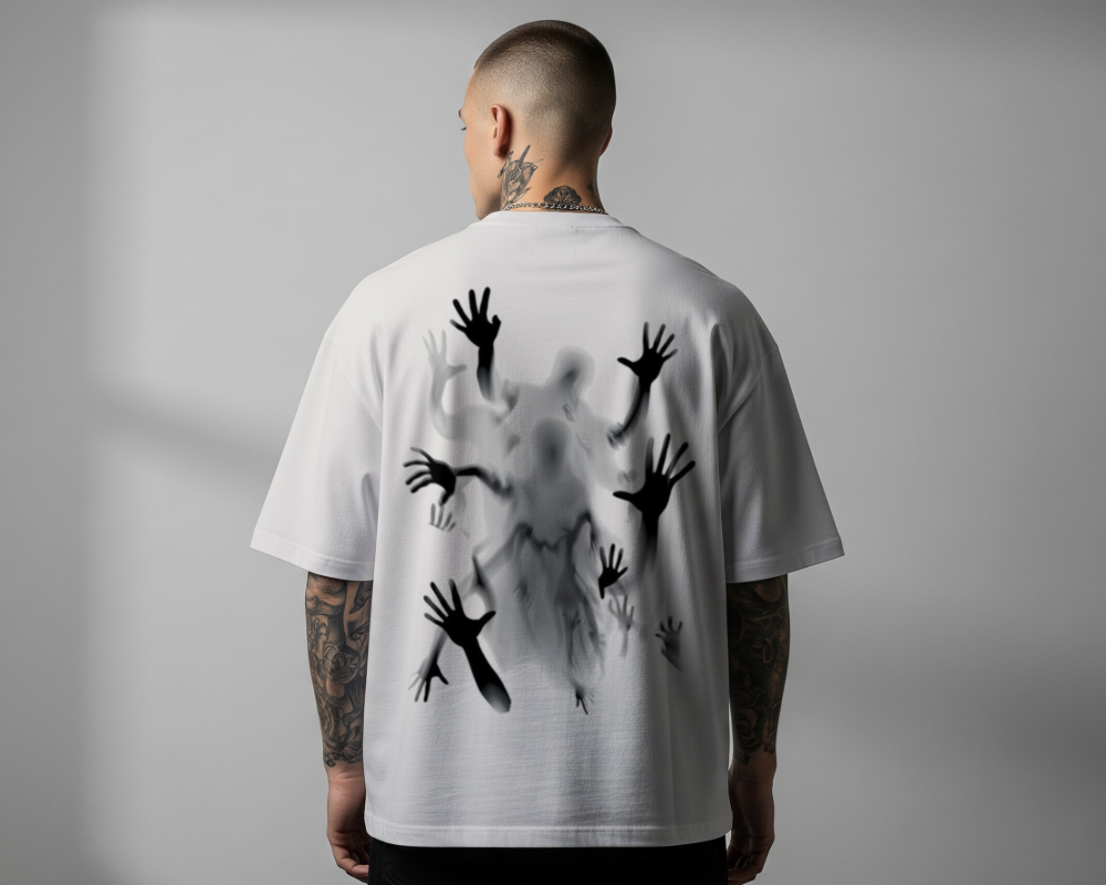 Back: The centerpiece of the garment is a large-scale, high-definition shadow-ghoul graphic. Utilizing a blurred, smoky aesthetic, it depicts a central ethereal figure surrounded by grasping, reaching hands that appear to emerge directly from the fabric.