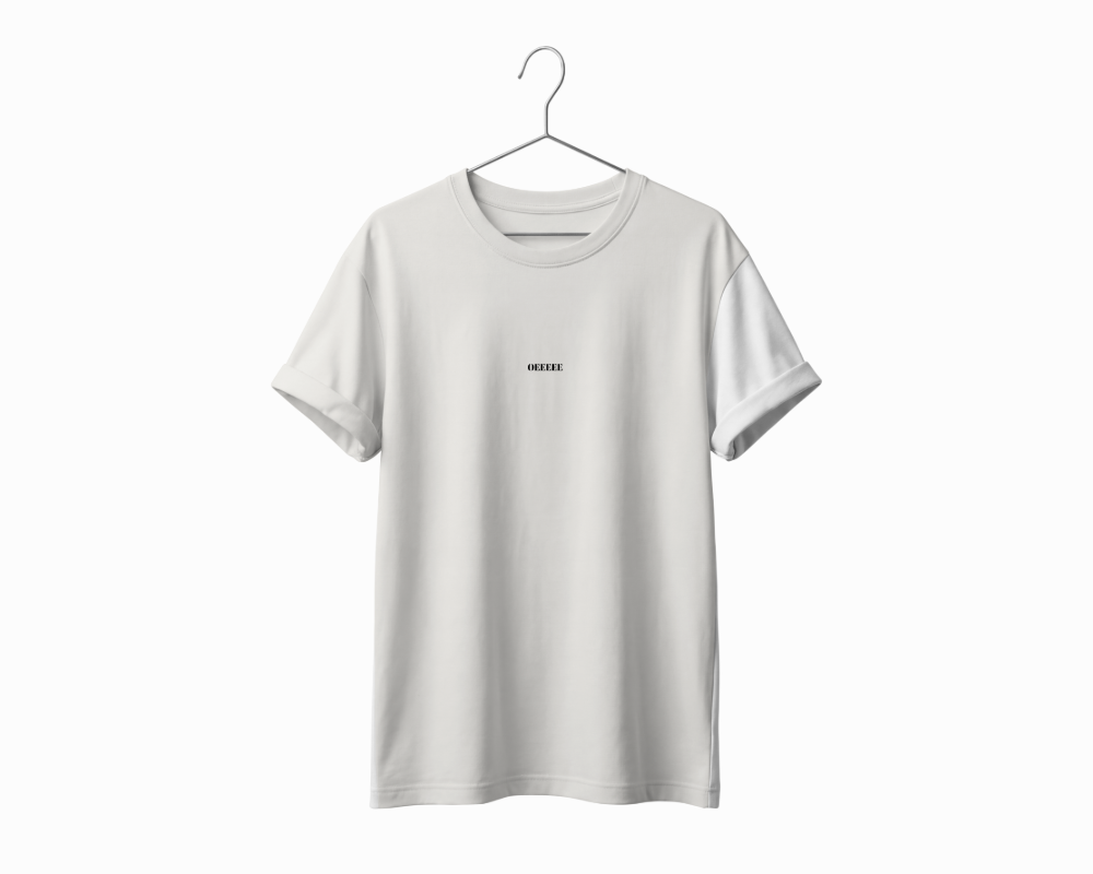 Front: A minimalist approach featuring the cryptic “OEEEEE” text centered on the chest in a sharp, bold typeface. It provides a clean, understated look that balances the intensity of the back design.